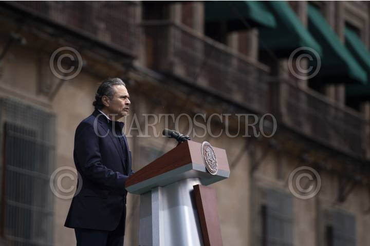 Simpatizantes del Presidente de México, Andrés López Obrador y de la 4T se dieron cita en el Zócalo para conmemorar el 85 Aniversario de la Expropiación Petrolera. En la imagen el titular de SADER, Víctor Villalobos.