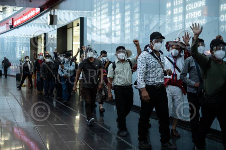 La delegación extemporánea del Ejército Zapatistade Liberación Nacional arribó al Aeropuerto Internacionalde Viena esta mañana. En el avión viajaron 103 zapatistas entre hombres, mujeres y niños desde la ciudad de México.