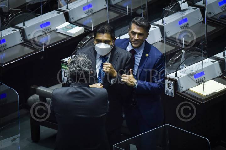 Sergio Mayer, diputado de Morena, junto a Jorge Luis Preciado, diputado del PAN, y Enrique Ochoa Reza, diputado del PRI, durante la reanudación de la sesión ordinaria en donde continúa la discusión de la desaparición de 109 fideicomisos públicos.
