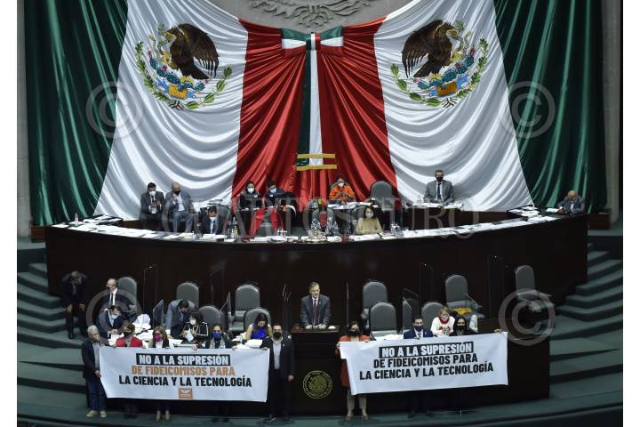 Eduardo Ron Ramos, diputado de Movimiento Ciudadano, e integrantes del mismo grupo parlamentario, protestaron durante la sesión ordinaria de la Cámara de Diputados en donde continúa la discusión de la desaparición de 109 fideicomisos públicos.