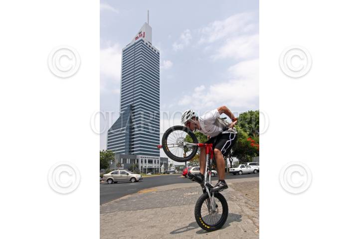 GUADALAJARA, JALISCO, 14MAYO2013.- El Colombiano seis veces Record Guinness, Javier Zapata, quien a impuesto records mundiales al subir a bordo de su bicicleta los edificios mas grandes de Latinoamérica, subirá el día de mañana el edificio mas grande de la ciudad, un reconocido hotel ubicado en la Av. López Mateos y Niños Héroes. FOTO: FERNANDO CARRANZA / CUARTOSCURO.COM