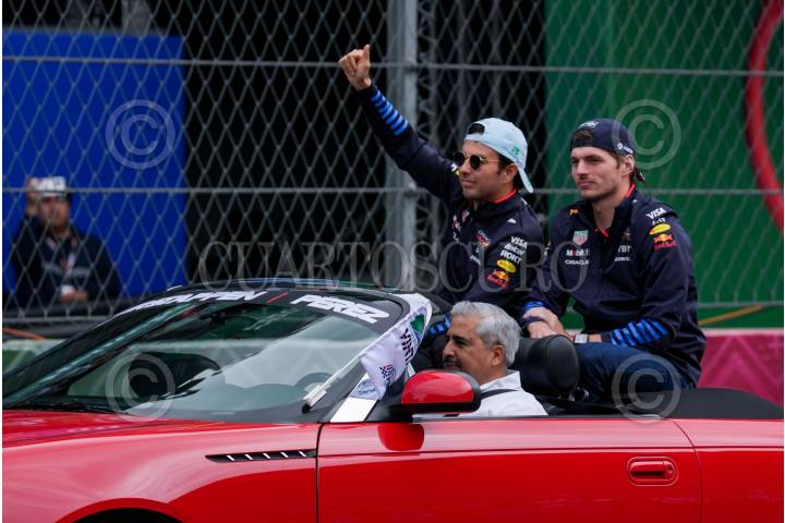 CIUDAD DE MÉXICO, 27OCTUBRE2024.- Los pilotos de Oracle Red Bull Sergio “Checo” Pérez y Max Verstappen durante el Desfile de las escuderías que compiten en la edición 2024 del Gran Premio de la Ciudad de México de la Fórmula 1 en el Autódromo Hermanos Rodríguez. FOTO: GALO CAÑAS/CUARTOSCURO.COM