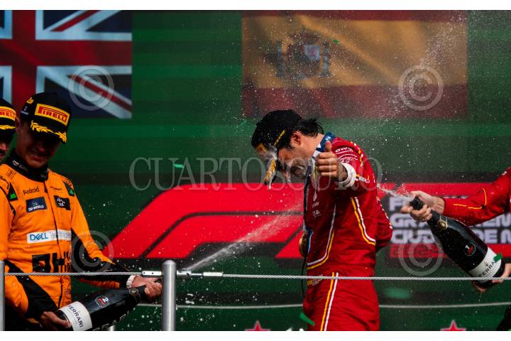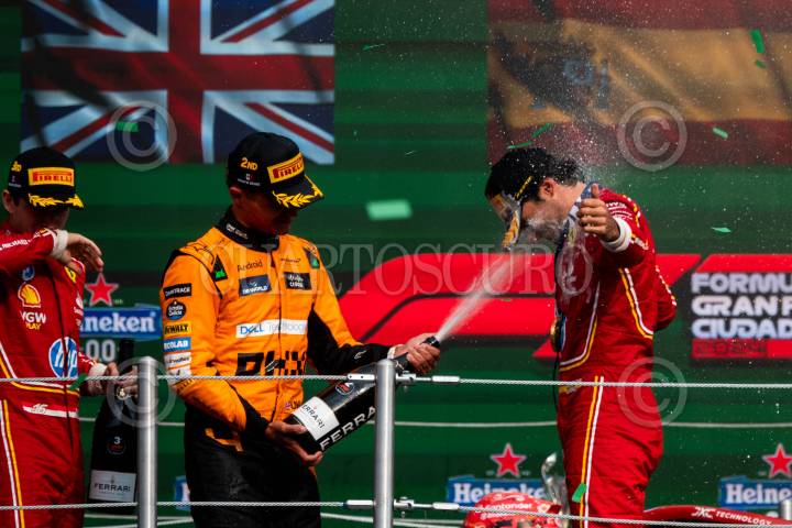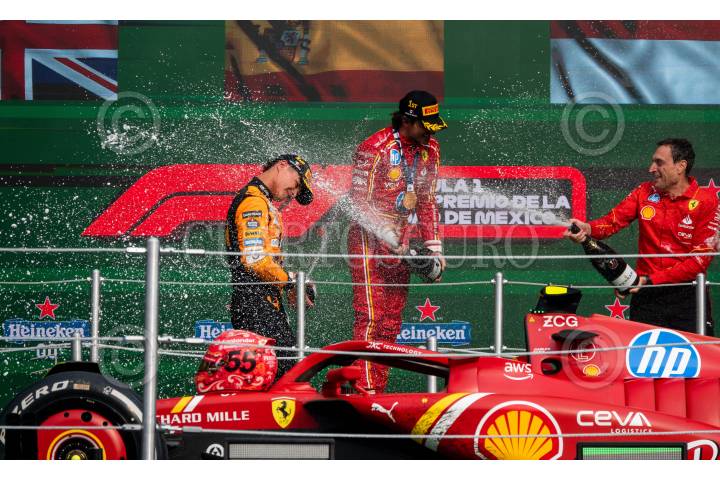 CIUDAD DE MÉXICO, 27OCTUBRE2024.- El piloto español Carlos Sainz (55) de la escudería Ferrari se coronó campeón del Gran Premio de la Ciudad de México de la Fórmula 1 en el Autódromo Hermanos Rodríguez. El segundo lugar fue para Lando Norris (4) de McLaren y el tercer puesto para el polaco Charles Leclerc (16) compañero de Sainz. FOTO: GALO CAÑAS/CUARTOSCURO.COM
