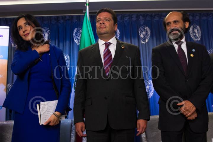 CIUDAD DE MÉXICO, 16OCTUBRE2018.- Francisco Javier García Berdejo; Crispim Moreira, representante de la Organización de las Naciones Unidas para la Alimentación y la Agricultura (FAO) en México, y Miguel Ruiz Cabañas, subsecretario para Asuntos Multilaterales y Derechos Humanos de la SRE, durante un evento conmemorativo por el Día Mundial de la Alimentación, en donde se destacó que a pesar de que en el mundo se producen los alimentos necesarios para alimentar a todas las personas del mundo un tercio de esta comida se desperdicia. FOTO: MOISÉS PABLO /CUARTOSCURO.COM