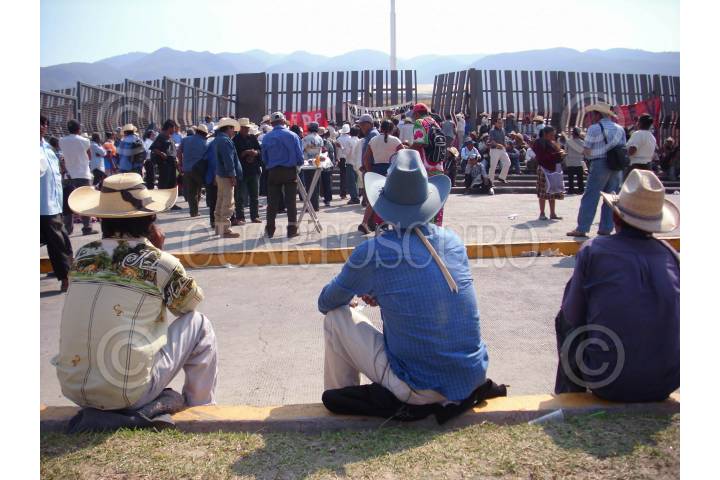 CHILPANCINGO, GUERRERO, 28ENERO2009.- Campesinos e indígenas pertenecientes al Frente de Defensa Popular (FDP) encabezados por su dirigente Efrain Torres Fierro tomaron la caseta de cobro "Palo Blanco" en la Autopista del Sol en todo momento los campesinos e indígenas fueron vigilados de muy cerca por elementos antimotines de la Policía Federal Preventiva y de la Policía del Estado. FOTO: OSCAR ALVARADO/CUARTOSCURO.COM