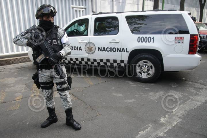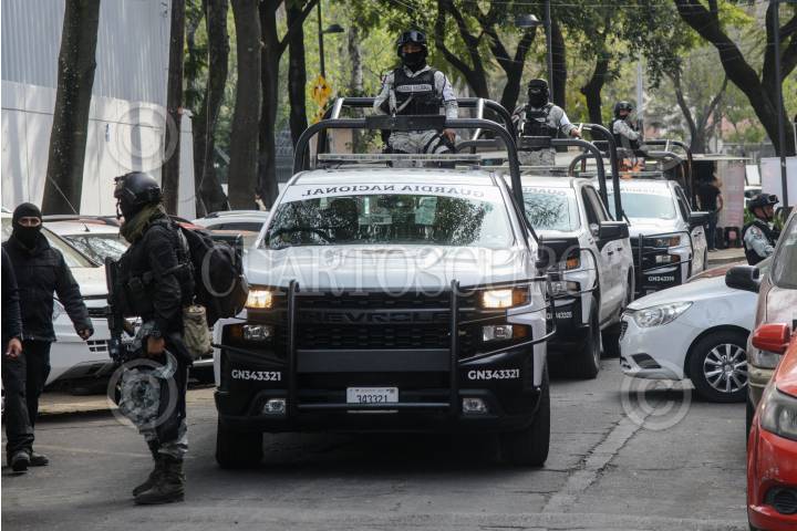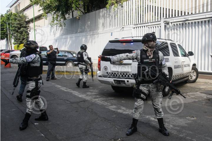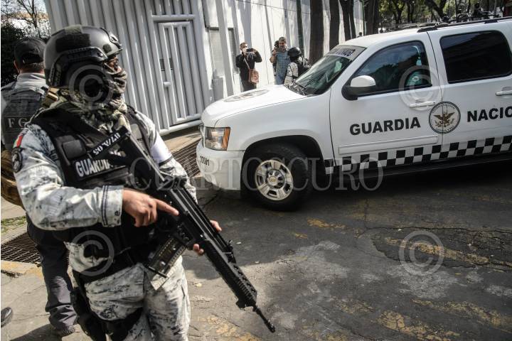 Elementos de la Guardia Nacional custodian la FEMDO debido al arresto de de Ovidio Guzmán.
