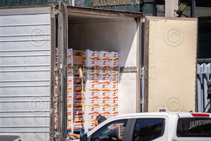 TIJUANA BAJA CALIFORNIA 06JULIO2025.- Trailer con las puertas abiertas, mostrándose al interior cajas con sustancias ilegales que fueron decomisadas por la FGR. Un tráiler con media tonelada de la droga sintética “cristal” fue asegurado por agentes de la FESC en la carretera Escénica Ensenada-Tijuana. La droga, oculta entre cajas de fruta, habría llegado desde Sinaloa vía La Paz y tenía como destino Tijuana. El conductor y la unidad fueron puestos a disposición de la FGR en Tijuana, donde se inició una investigación. FOTOS JOSÉ VARGAS / CUARTOSCURO.COM
