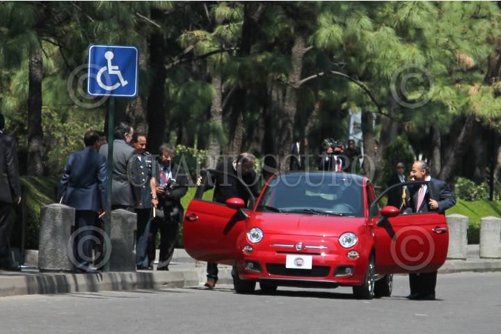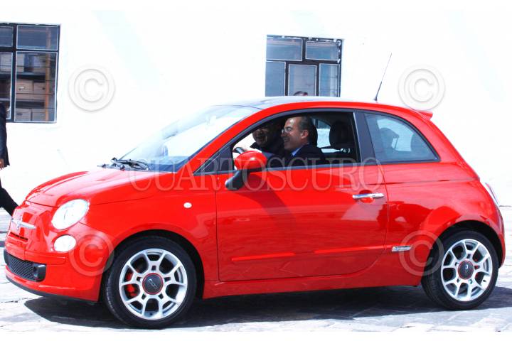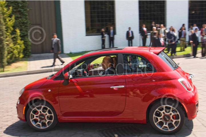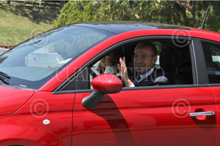 TOLUCA, ESTADO DE MÉXICO, 08FEBRERO2010.- Felipe Calderón, Presidente de México, se subio al nuevo carro FIAT 500 luego de la conferencia que se realizo en la explanada de los Conos de Chrysler. FOTO: ALFREDO GUERRERO/CUARTOSCURO.COM