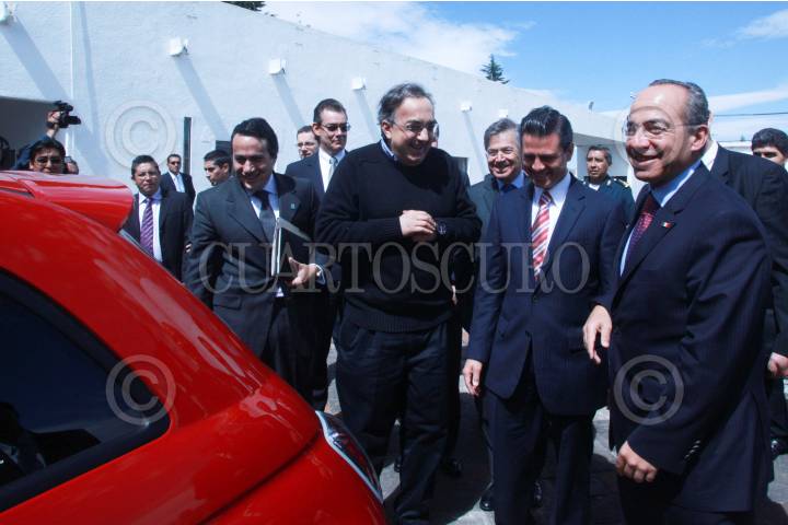 TOLUCA, ESTADO DE MÉXICO, 08FEBRERO2010.- Sergio Marchionne, Presidente de Chrysler junto a Enrique Peña Nieto, Gobernador del Estado y Felipe Calderón, Presidente de México, durante el anuncio oficial de la fabricación del nuevo vehículo, FIAT 500 en la explanada de los Conos de Chrysler. FOTO: ALFREDO GUERRERO/CUARTOSCURO.COM