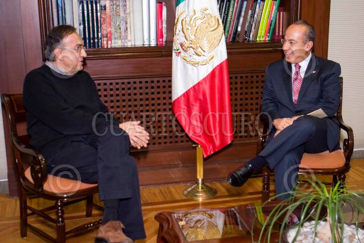 MÉXICO, 07MARZO2011.- Sergio Marchionne, Presidente y director ejecutivo del grupo Chrysler converso con Felipe Calderon, Presidente de México durante la presentacion del vehiculo 2FIAT 500". FOTO: HERMES QUETZALCOATL/CUARTOSCURO.COM