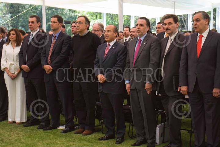 MÉXICO, 07MARZO2011.- Sergio Marchionne, Presidente y director ejecutivo del grupo Chrysler junto a Felipe Calderon, Presidente de México y Bruno Ferrari, Secretario de Economia durante la presentacion del vehiculo 2FIAT 500". FOTO: HERMES QUETZALCOATL/CUARTOSCURO.COM