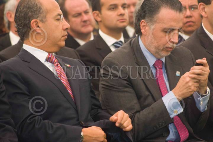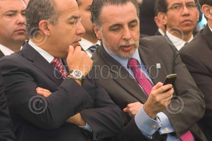 MÉXICO, 07MARZO2011.- Felipe Calderon, Presidente de México junto a Bruno Ferrari, Secretario de Economia durante la presentacion del vehiculo "FIAT 500". FOTO: HERMES QUETZALCOATL/CUARTOSCURO.COM