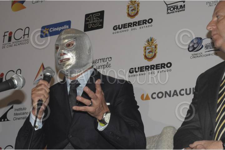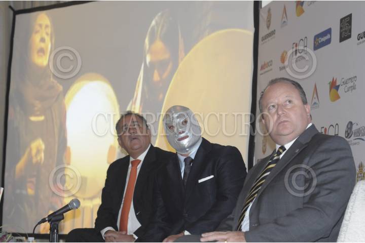 MÉXICO, D.F., 13NOVIEMBRE2012.- Javier Aluni Montes, Secretario de Fomento Turístico del Estado de Guerrero, el director del Festival Internacional de Cine de Acapulco (FICA) y el Hijo del Santo durante una conferencia de prensa en el hotel St. Regis de la Ciudad de México para dar a conocer los pormenores de la octava edición del FICA que se llevará a cabo del 23 al 30 de noviembre en los destinos del Triángulo del Sol. FOTO: BERNANDINO HERNANDEZ /CUARTOSCURO.COM