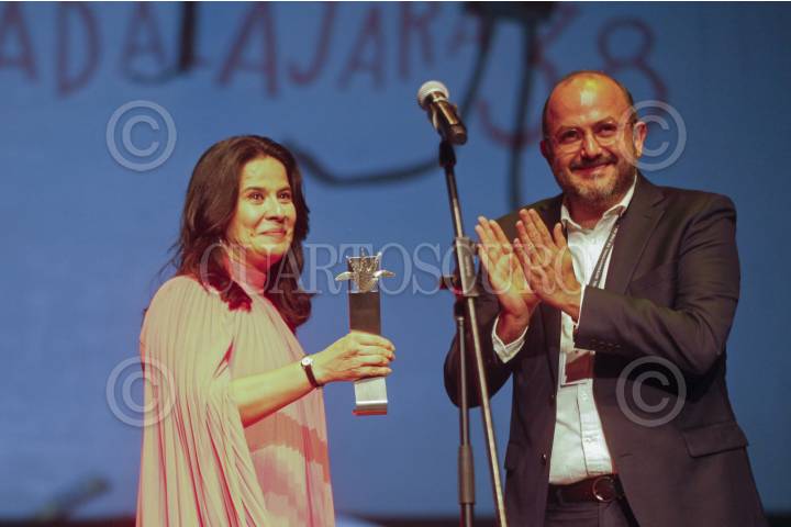 Estrella Araiza, Directora del Festival Internacional de Cine en Guadalajara (FICG) , durante la entrega del Mayahuel Internacional de Plata al Director de Fotografía Italiano, Roberto Perpignani, esto durante la inauguración de la edición 38 del FICG.