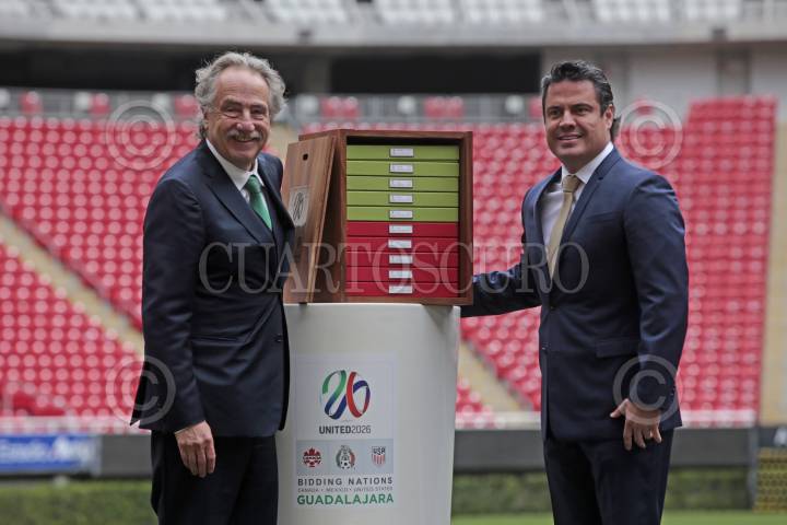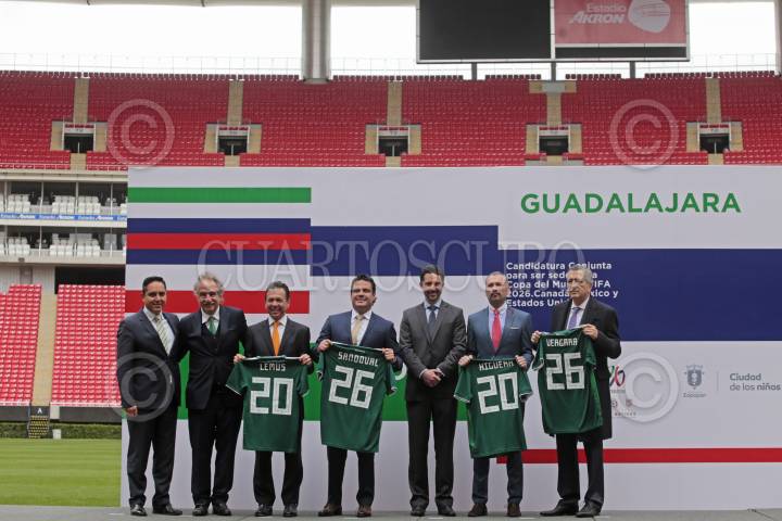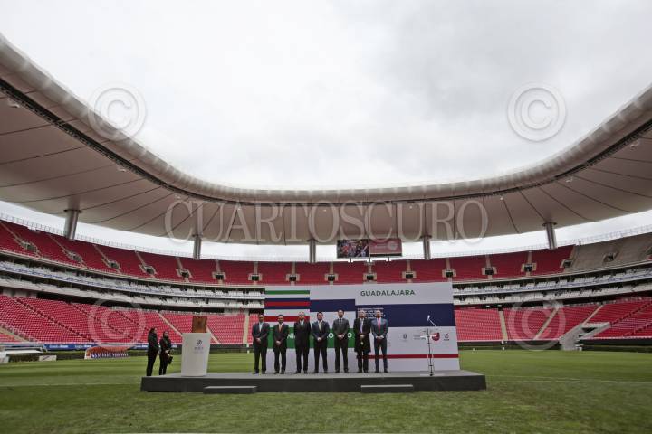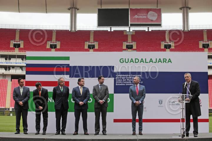 ZAPOPAN, JALISCO. 09ABRIL2025.- Esta Mañana en el Estadio Akron, Pablo Lemus Navarro Gobernador de Jalisco, Amaury Vergara Presidente del Club Deportivo Guadalajara, entre otras personalidades, encabezaron la presentación y develación del Poster Oficial de Guadalajara, ciudad sede rumbo a la Copa Mundial de la FIFA 2026. FOTO: FERNANDO CARRANZA GARCIA / CUARTOSCURO.COM