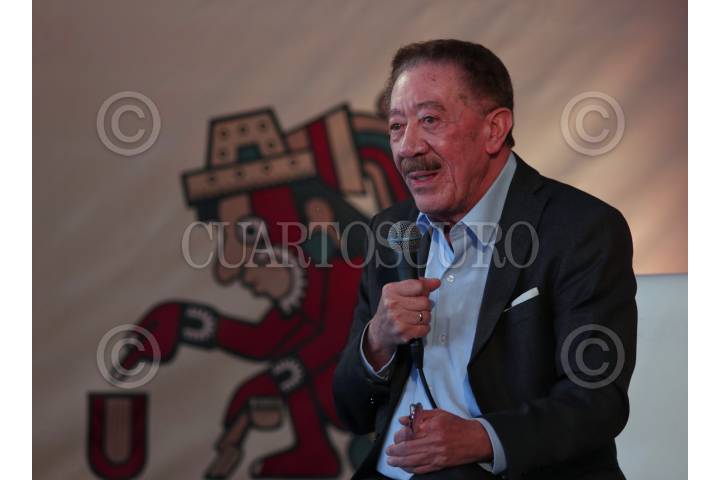 Héctor Díaz Polanco, presidente del Congreso de la Ciudad, durante charla "La 4t va" en la XXI Feria Internacional del Libro en el Zócalo.
