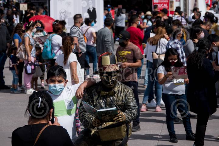 Un estatua viviente se toa foto con asistentes de la FIL Zócalo durante el penúltimo día de actividades.