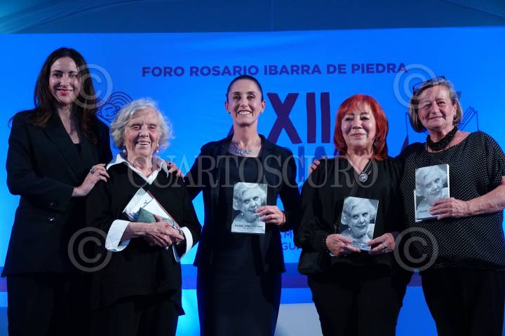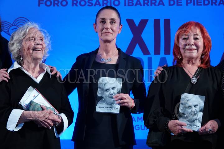 Elena Poniatowska, Claudia Sheinbaum y Rosario Ibarra Piedra durante la inauguración de la FIL en el Zócalo.