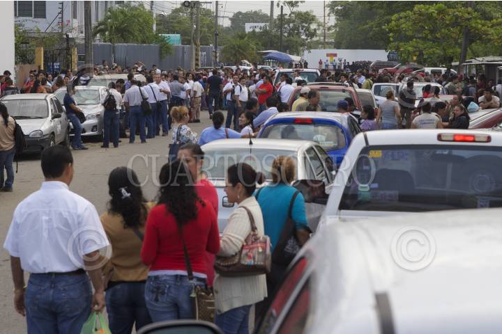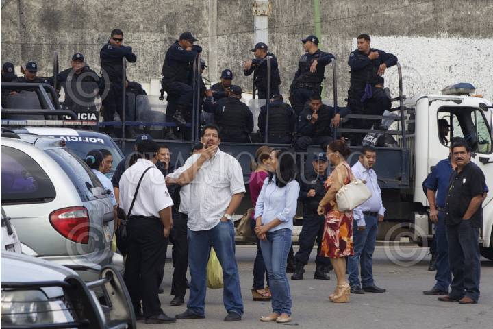 VILLAHERMOSA, TABASCO, 09DICIEMBRE2014.- Un grupo de habitares de la colonia Gaviotas Sur bloquean la calle El Camionero en la colonia Primero de Mayo en demanda del pago del FONDEN. Al menos son doscientos manifestantes que hicieron una vaya humana afuera de las oficinas de SEDESOL, sin embargo también afectan a empleados de la SCT y de la Junta Estatal de Caminos, donde no dejan pasar personas a pie o en vehículos; ante los hechos el cuerpo de granaderos de la SSP observa sin realizar acción alguna. FOTO: MARCO POLO GUZMÁN HERNÁNDEZ/CUARTOSCURO.COM