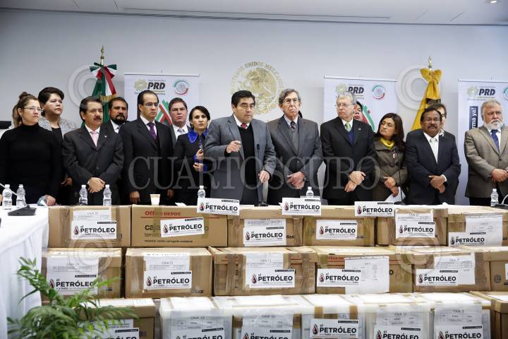 MÉXICO, D.F., 14NOVIEMBRE2013.- Senadores en integrantes del Partido de la Revolución Democrática, entregaron los paquetes de firmas con los que pretenden se realice una consulta pública de la reforma energética. FOTO: CUARTOSCURO.COM
