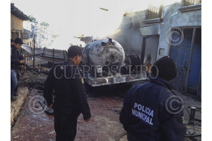 COMITANDEDOMINGUEZ, CHIAPAS, 16ENERO2014.- Esta mañana una pipa cargada con 10 mil litros de gas LP explotó y dejó al menos seis heridos y diversos daños materiales en la zona del Centro Histórico. Autoridades policiales informaron que hasta el momento no se reportan pérdidas humanas, pero sí daños materiales a viviendas, entre ellas una propiedad de Roberto Albores Guillén, ex gobernador del estado. FOTO: CUARTOSCURO.COM