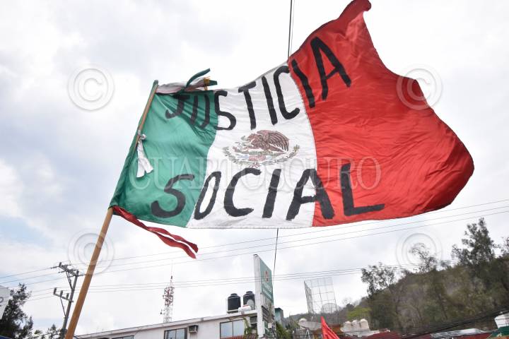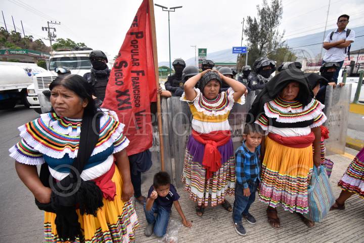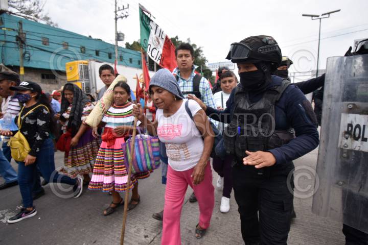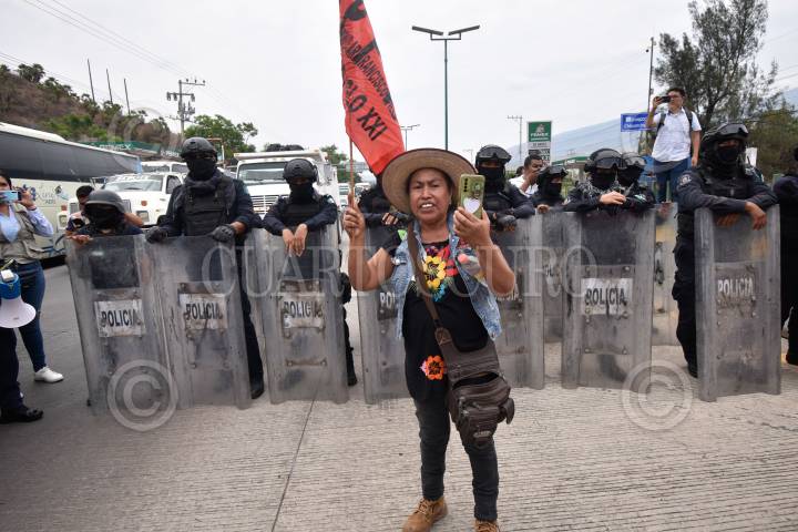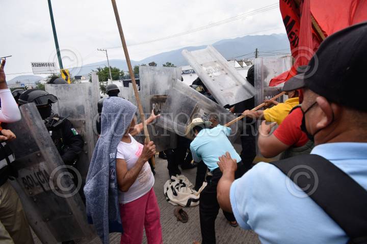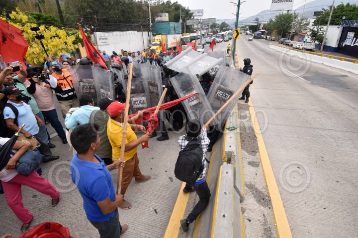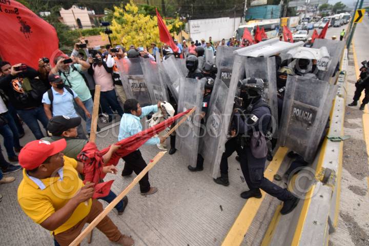 Entre empujones, palos y toletes, integrantes del Frente Popular Francisco Villa (FPFV) y elementos de la Secretaría de Seguridad Pública (SSP) del Estado, se confrontaron en los sentidos sur-norte de las Autopista del Sol.