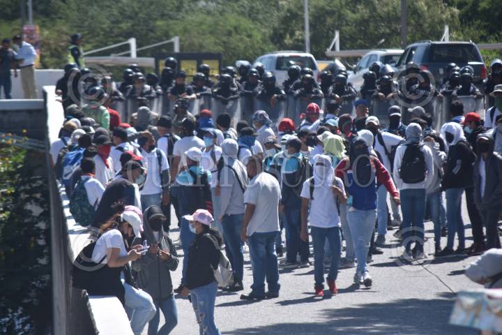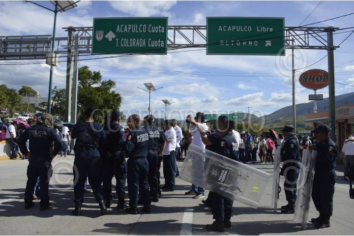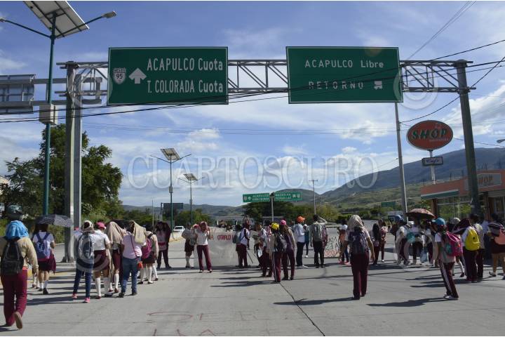 CHILPANCINGO, GUERRERO, 22FEBRERO2024.- El Frente Único de Normales Públicas del Estado de Guerrero (FUNPEG) bloquearon la Autopista del Sol a la altura del Parador del Marqués para exigir la liberación de 37 de sus compañeros detenidos por la Guardia Nacional y presentados ante la Fiscalía General del Estado de Guerrero (FGE) por intento de robo de un autobús de la empresa Estrella de Oro en Acapulco. Los alumnos estuvieron bloqueando los diferentes accesos a palacio de gobierno en donde pedían ser atendidos por la gobernadora del estado, Evelyn Salgado Pineda. FOTO: DASSAEV TÉLLEZ ADAME/CUARTOSCURO.COM