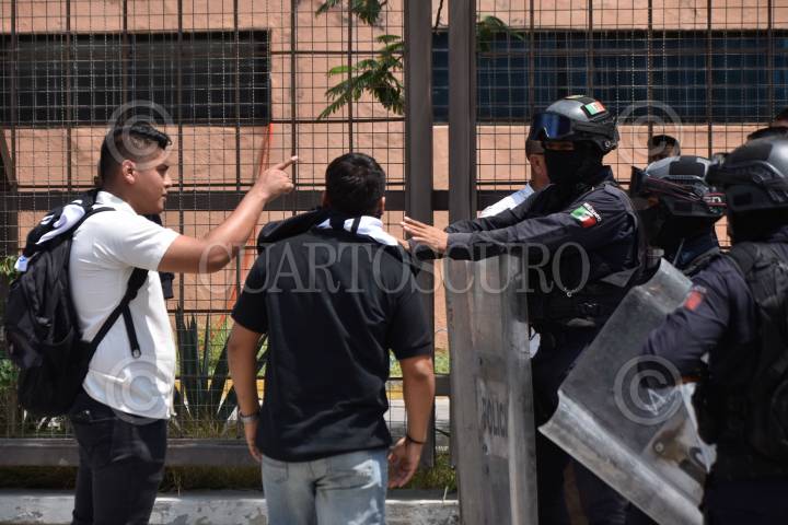 CHILPANCINGO, GUERRERO, 12ENERO2017.- Normalistas que conforman el Frente Unidos de Normales Públicas del Estado de Guerrero (FUNPEG) marcharon del monumento Benito Juárez a la Subsecretaría de Administración y Finanzas de la SEG, actividad que llevaron a cabo para exigir que se les entregué material didáctico y una laptop a cada uno de los estudiantes de nuevo ingreso. Policías antimotines ya los esperaban e impidieron el ingreso al frente de las instalaciones. FOTO: JOSÉ I. HERNÁNDEZ / CUARTOSCURO.COM