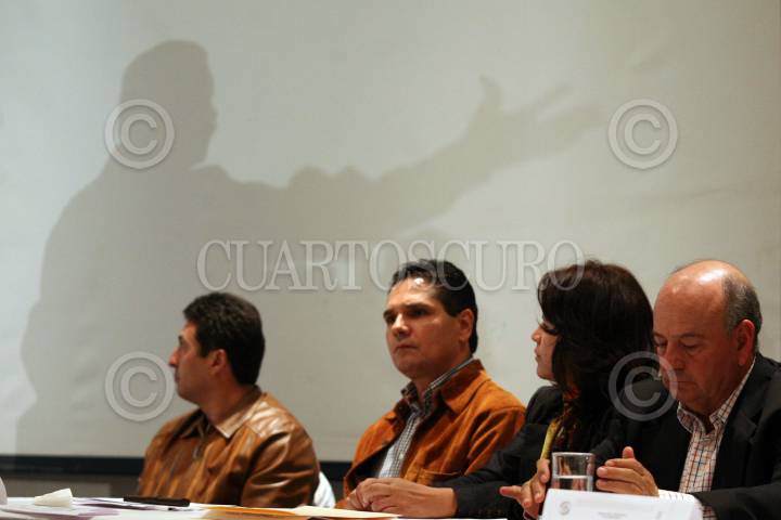 MORELIA, MICHOACAN 18OCTUBRE2009.- Victor Baez, diputado federa, Silvano Aureoles, senador, Fabiola Alanis, dirigente del PRD estatal y el senador Jesús Garibay durante el anuncio de la propuesta económica del PRD, evento donde el coordinador parlamentario del PRD, presentó la Propuesta alternativa al Paquete Economíco del Gobierno Federal, la cual contempla eliminar el 2 por ciento al consumo generalizado. FOTO: CUARTOSCURO.COM