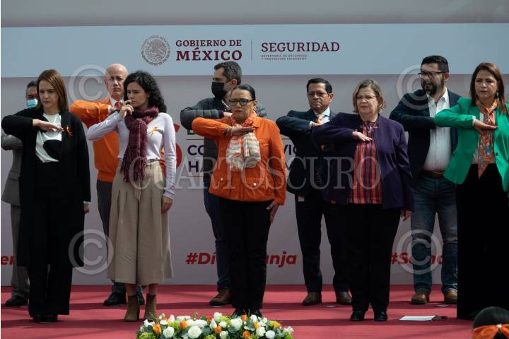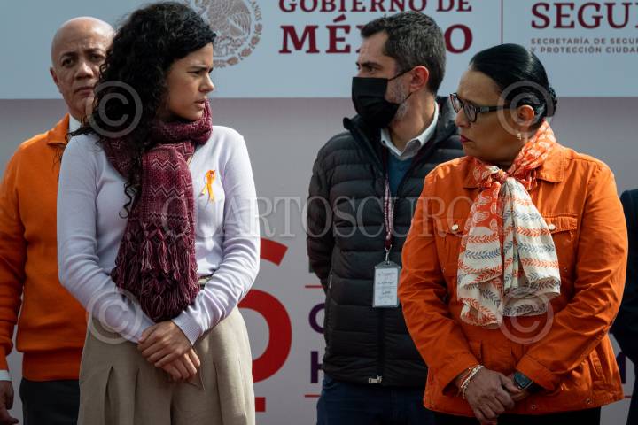 Luisa María Alcalde y Rosa Icela Rodríguez durante la ceremonia de inauguración de la campaña 16 Días de Activismo contra la Violencia hacia las Mujeres en la sede de la SSPC.