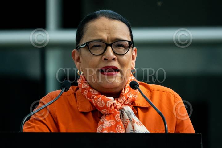 Luisa María Alcalde durante la ceremonia de inauguración de la campaña 16 Días de Activismo contra la Violencia hacia las Mujeres en la sede de la SSPC.