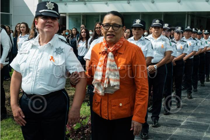 Rosa Icela Rodríguez durante la ceremonia de inauguración de la campaña 16 Días de Activismo contra la Violencia hacia las Mujeres en la sede de la SSPC.