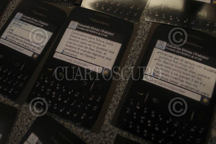 OAXACA, OAXACA, 06NOVIEMBRE2012.- Estudiantes de la Facultad de Idiomas de la UABJO, quienes aseguraron ser integrantes del consejo técnico, presentaron una serie de pruebas en las que relacionan al rector Eduardo Martínez Helmes y al director de esta facultad Diego González Algara, con el ataque de porros ocurrido a principios del mes de octubre en sus instalaciones. Según lo señalado por los jóvenes se encontró un celular que perteneció a González Algara que contiene los mensajes que supuestamente los incriminan. Las fotografías y celular les fue entregado de forma anónima en las instalaciones de la facultad, las cuales mantienen tomadas. FOTO: ARTURO PÉREZ ALFONSO /CUARTOSCURO.COM