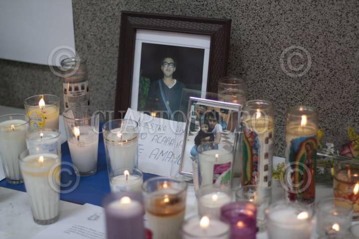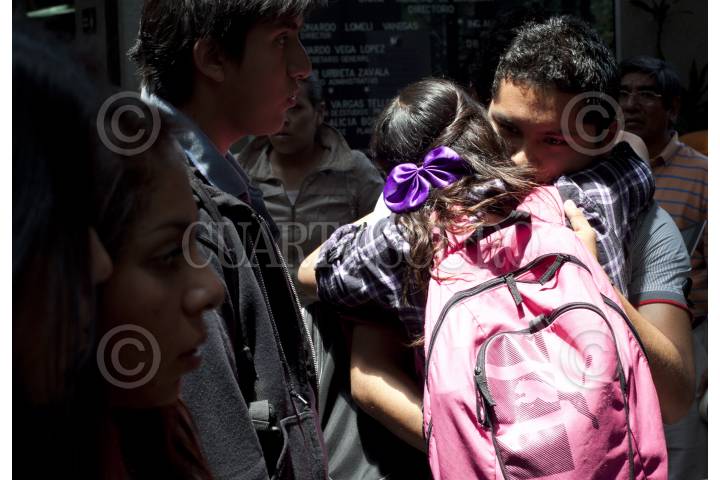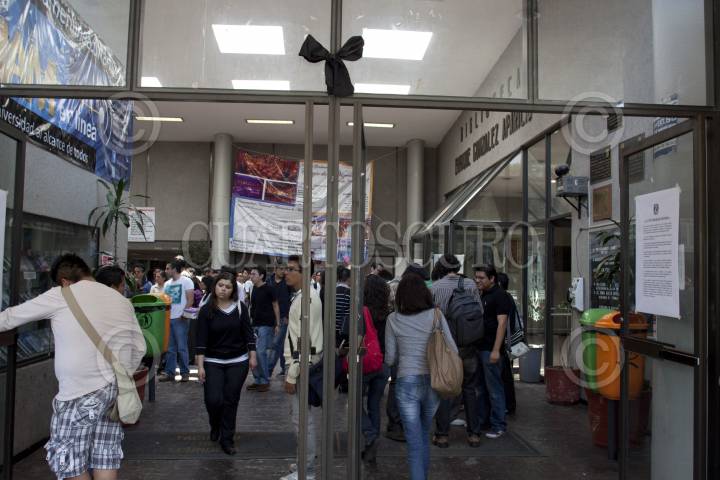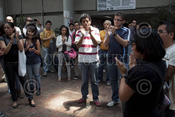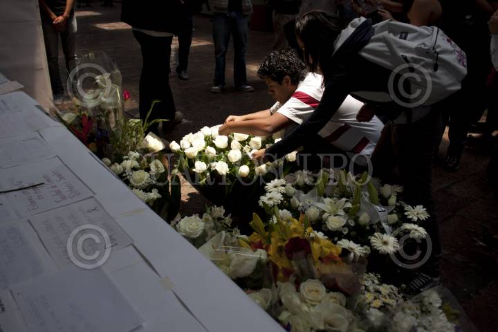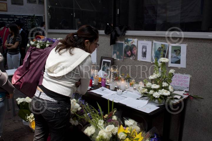 MÉXICO, D.F., 13ABRIL2012.- Con muestras de afectos los estudiantes de la facultad de Economía en la UNAM mostraron sus condolencias a las familias de los cinco compañeros que murieron el día de ayer en un accidente vehicular, el alumnado también mostró sus respetos por el profesor que pereció en el percance. Los jóvenes llevaron flores, escribieron mensajes de duelo, y les rindieron un minuto de aplausos, en el pequeño altar improvisado que se instaló en la entrada de la facultad. FOTO: MOISÉS PABLO /CUARTOSCURO.COM