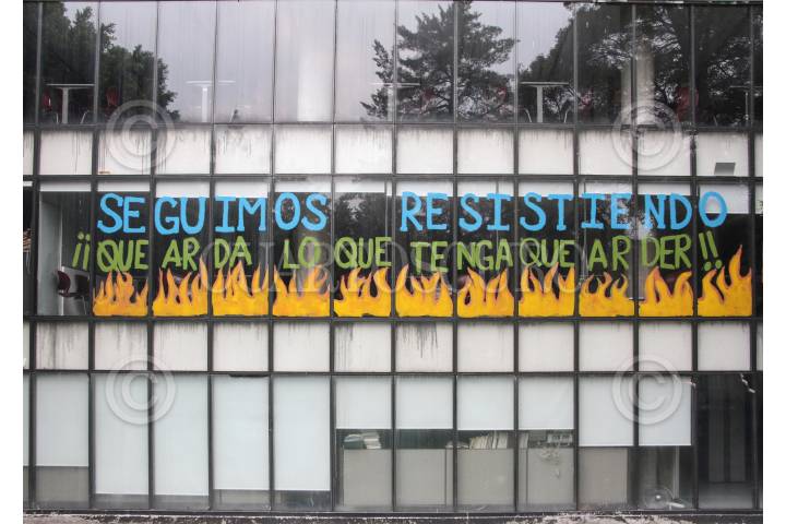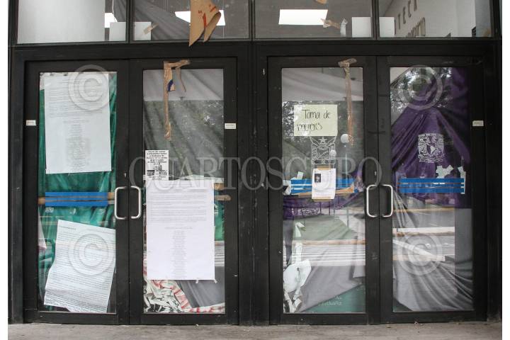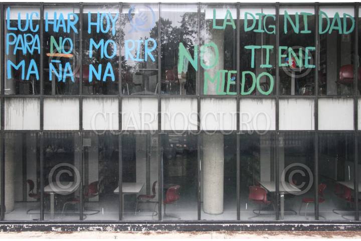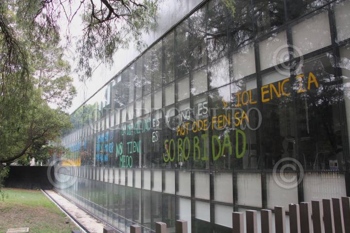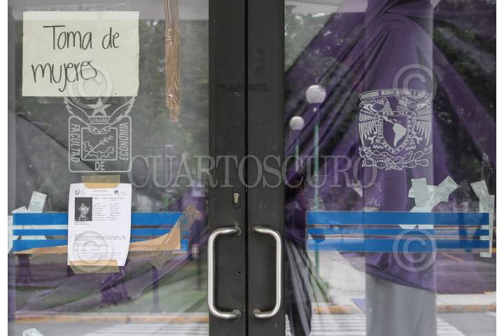 Aspectos de la Facultad de Economía de la UNAM, la cual sigue tomada por mujeres universitarias.