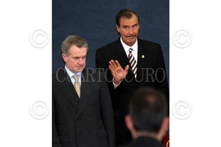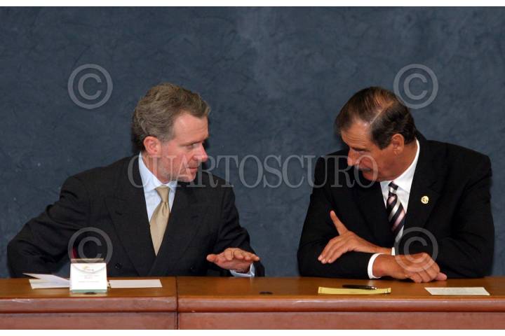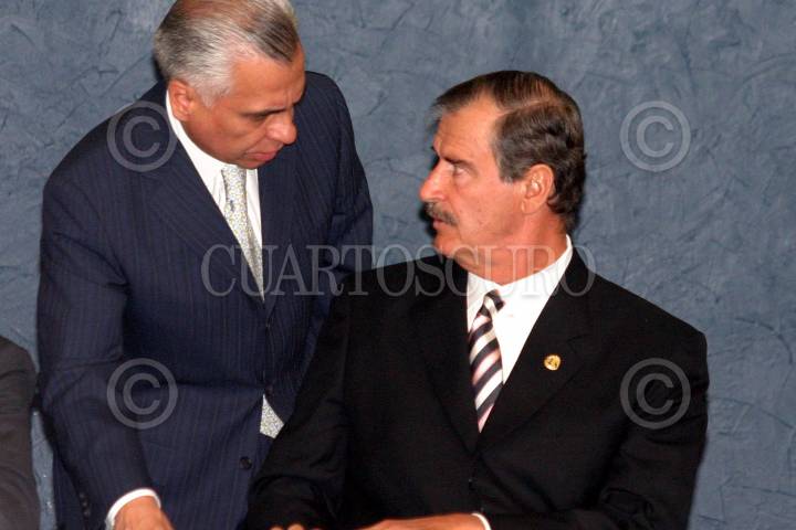 MEXICO, D.F., 30MARZO2005.- Santiago Creel, secretario de Gobernación y Vicente Fox Quesada, presidente de la Republica, durante la ceremonia de Incorporación de México al Protocolo Facultativo de la Convención Contra Tortura, en la residencia de los Pinos. FOTO: Moisés Pablo/CUARTOSCURO.COM