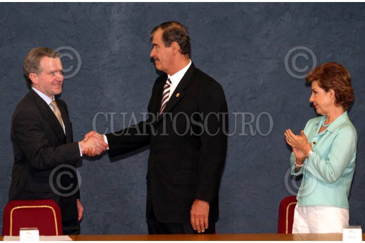 MEXICO, D.F., 30MARZO2005.- Santiago Creel, secretario de Gobernación, Vicente Fox Quesada, presidente de la Republica y Marta Sahagún, primera dama, durante la ceremonia de Incorporación de México al Protocolo Facultativo de la Convención Contra Tortura, en la residencia de los Pinos. FOTO: Moisés Pablo/CUARTOSCURO.COM