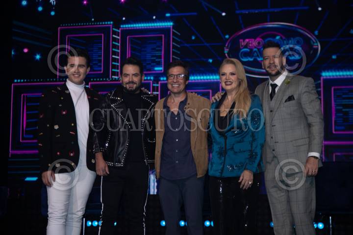 José Eduardo Dervez, Miguel Ángel Fox, Erika Buenfil y Faisy durante la presentación a medios del nuevo programa “Veo cómo cantas”, en instalaciones de Televisa Univisión.
