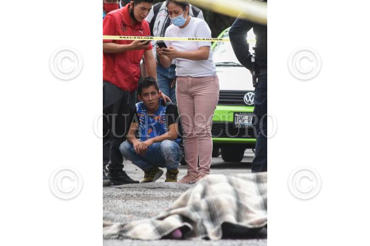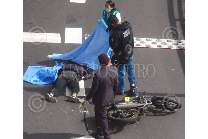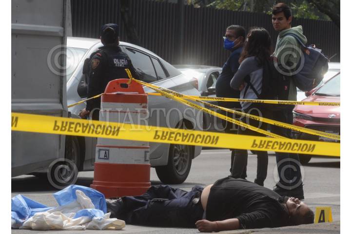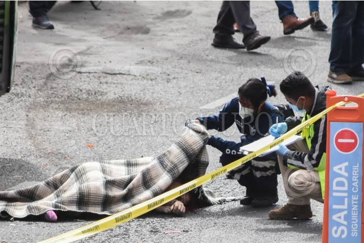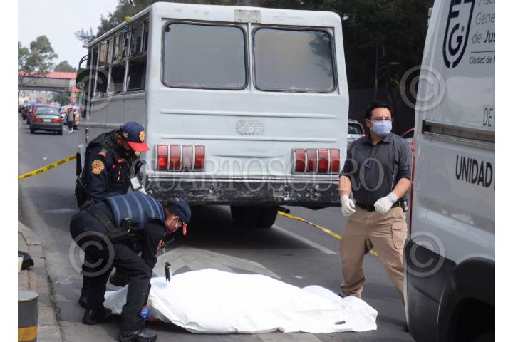 Peritos de la fiscalia capitalina cubre el cuerpo del joven que murió al quedar prensado entre dos camiones.