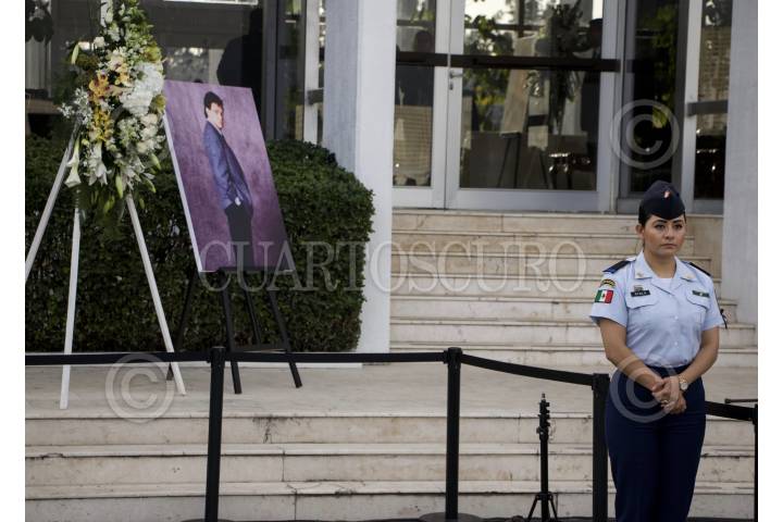 CIUDAD DE MÉXICO, 09OCTUBRE2019.- Los restos de el cantante José José, llegaron por la mañana de este miércoles al Hangar del 6to Grupo Aéreo, abordo de un avión Avión Boeing, 737 de la Fuerza Aerea. En imagen una soldado hace guardia frente a una corona luctuosa y una imagen del también llamado príncipe de la canción. FOTO: ROGELIO MORALES /CUARTOSCURO.COM