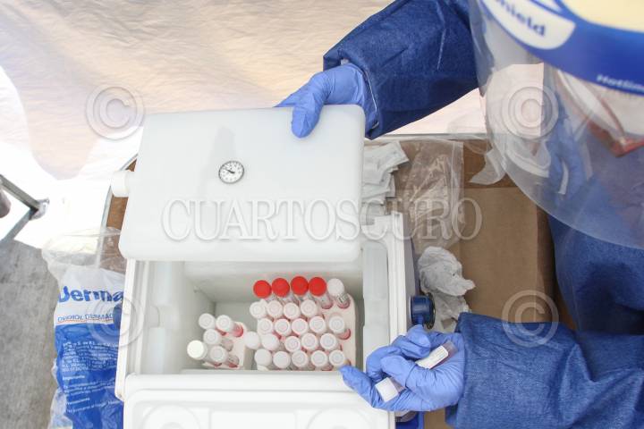 Doctora guarda muestras de pruebas de COVID-19 en hielera, esto en el Kiosco de la Salud de la colonia las Torres. FOTO: ROGELIO MORALES /CUARTOSCURO.COM