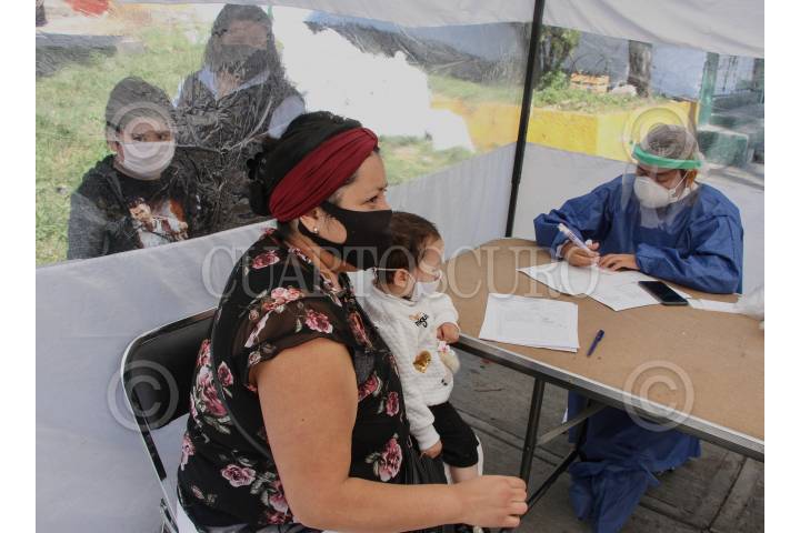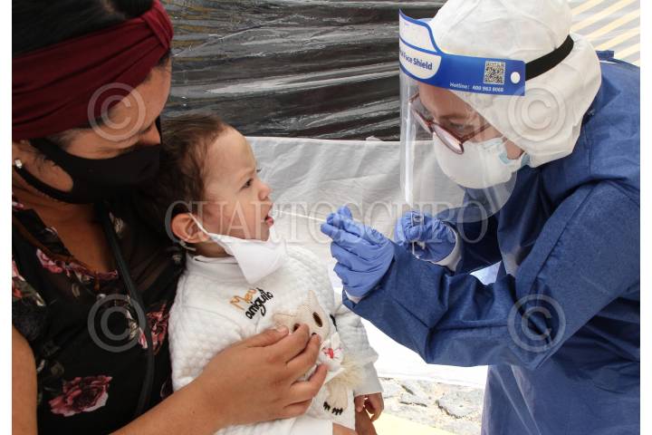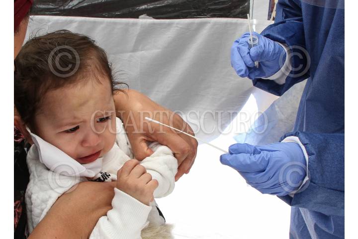 Bebé mira con atención a la doctora quien le realiza la toma de muestra de saliva para la prueba COVID-19 en el Kiosco de la Salud de la alcaldía Magdalena Contreras. FOTO: ROGELIO MORALES /CUARTOSCURO.COM