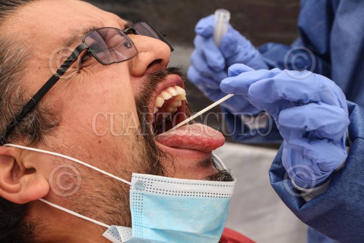 Hombre durante la toma de muestra bucal para la detección de COVID-19 realizada en el Kiosco de la Salud. FOTO: ROGELIO MORALES /CUARTOSCURO.COM