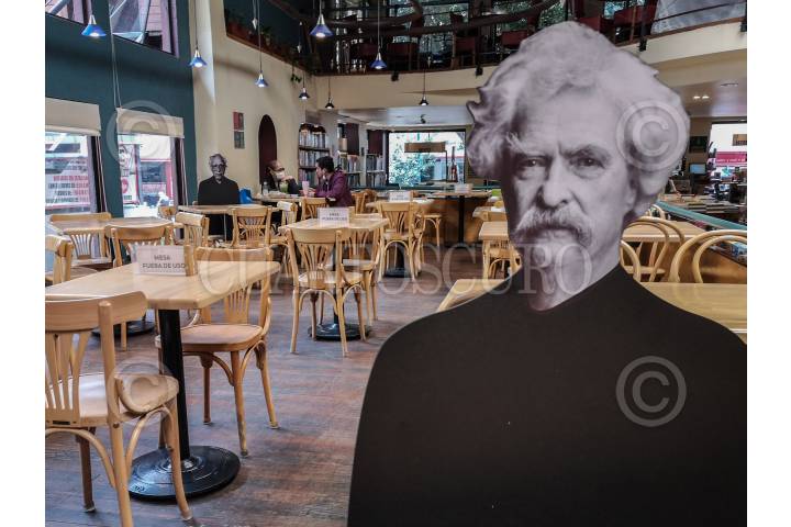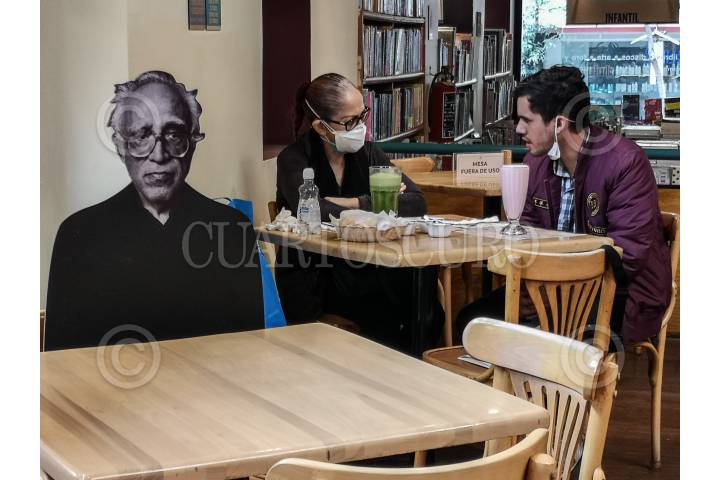 La Cafebrería El Péndulo Zona Rosa, colocó afiches de personajes de la literatura como medida de fomentar sana distancia entre mesas.