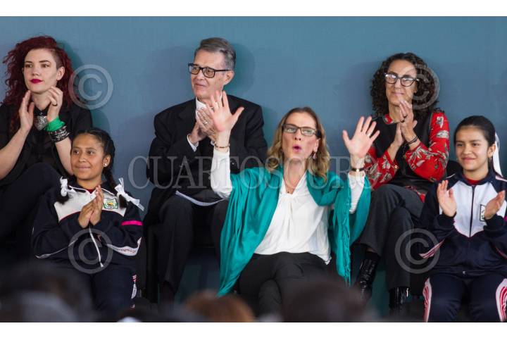 CIUDAD DE MÉXICO, 03SEPTIEMBRE2024.- Leticia Ramírez, titular de la SEP; Beatriz Gutiérrez Müller, investigadora y esposa del Presidente de México; Martí Batres, Jefe de Gobierno, y Clara Brugada, Jefa de Gobierno Electa, bailan a ritmo de las letras de Aczino al finalizar la última sesión de los "Fandangos por la Lectura", que se llevaron a cabo Escuela Secundaria Diurna No. 1 "César A. Ruiz", en el Centro Histórico. FOTO: MOISÉS PABLO/CUARTOSCURO.COM