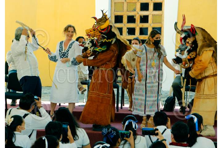 Beatriz Gutiérrez Müller, esposa del Presidente de México, y Evelyn Salgado Pineda, gobernadora de Guerrero, bailaron la tradicional banda de Los Diablos de Teloloapan, durante el acto Fandangos por la Lectura.