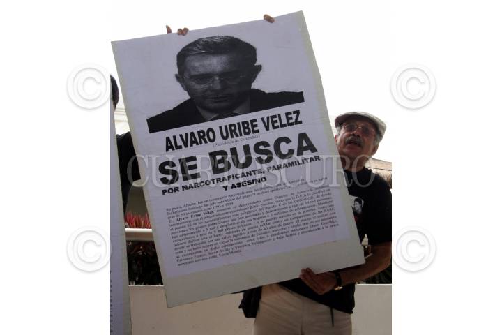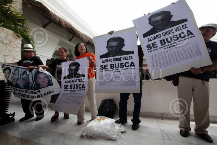 RIVERA MAYA, CANCÚN, 23FEBRERO2010.- Familiares de la estudiante Lucía Moret y las personas fallecidas durante un operativo militar de Colombia en la frontera con Ecuador se manifestaron afuera del hotel Princess, donde se encuentra toda la prensa, en contra de Álvaro Uribe, mandatario colombiano. FOTO: AMARANTA PRIETO/CUARTOSCURO.COM