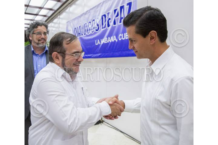 LA HABANA, CUBA, 23JUNIO2016.- El Presidente Enrique Peña Nieto saludó hoy al comandante de las Fuerzas Armadas Revolucionarias de Colombia-Ejército del Pueblo (FARC-EP), Rodrigo Londoño Echeverri, a quien felicitó por la firma de los Acuerdos de Paz en esa nación, que ponen fin al último conflicto armado en América Latina, tras más de 50 años de enfrentamientos. FOTO: PRESIDENCIA /CUARTOSCURO.COM