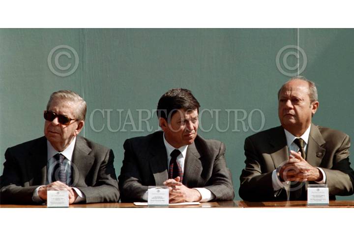 Arsenio Farell, Rogelio Montemayor y Carlos Romero de Deschamps, durante la presentación del Programa de Energía 2000 en la explanada del Museo Tecnológico de la Comisión Federal de Electricidad. FOTO: Victoria Valtierra/Cuartoscuro