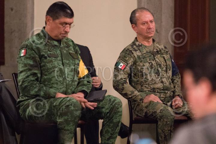 El Secretario de Defensa Luis Cresencio Sandoval y el Secretario de Marina José Rafaél Ojeda Durán en la conferencia matutina del día de hoy, en la que se anunció el inicio de la Fase Tres de la Contingencia Sanitaria por la pandemia de COVID-19.